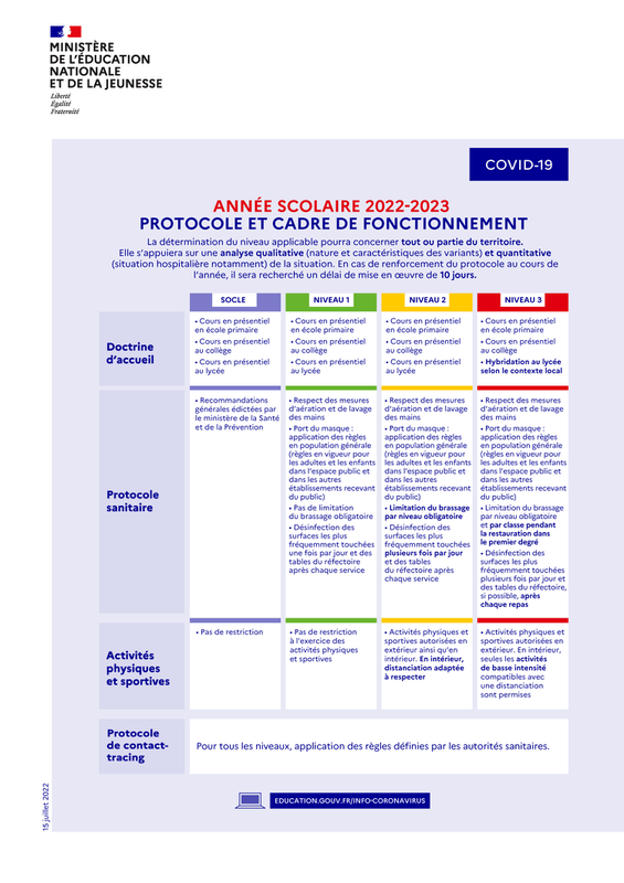 Au regard de la situation sanitaire actuelle, et sur la recommandation des autorités sanitaires, le niveau socle est retenu à compter de la rentrée scolaire pour l’ensemble du territoire national.· le lavage régulier des mains ou la mise à disposition de produits hydroalcooliques ;