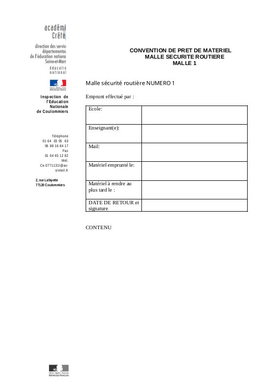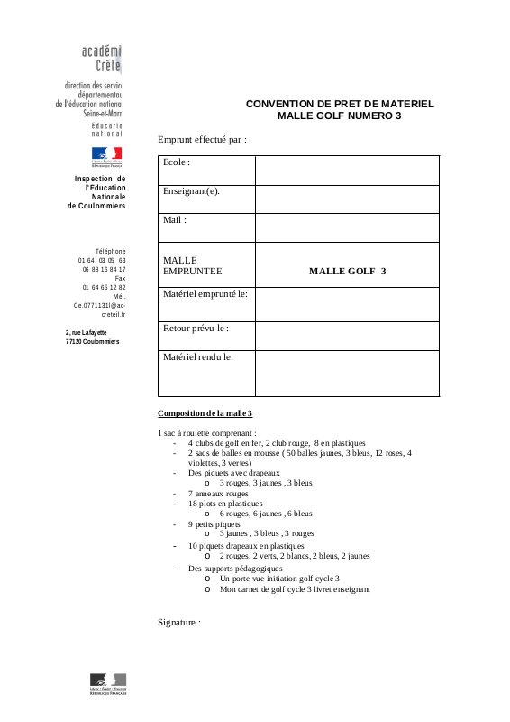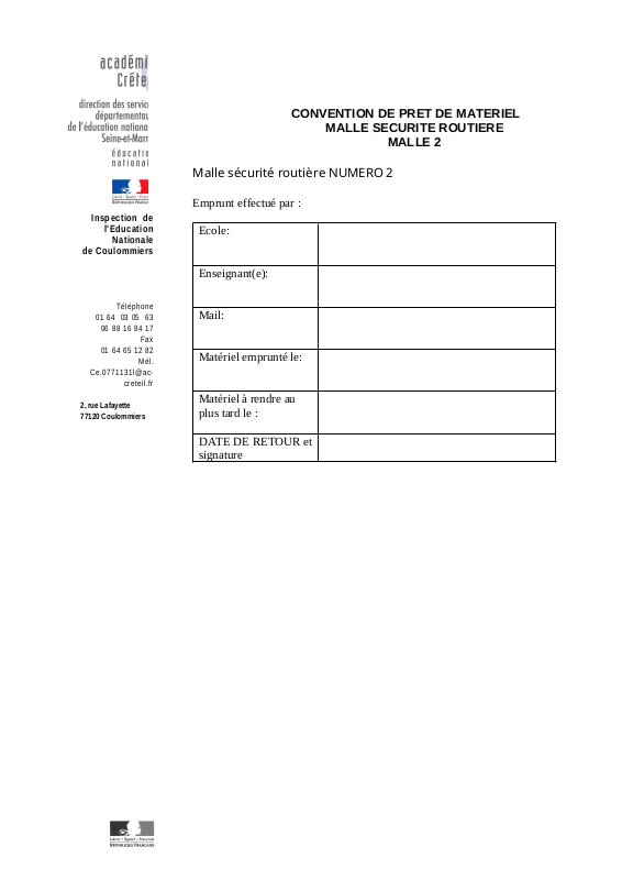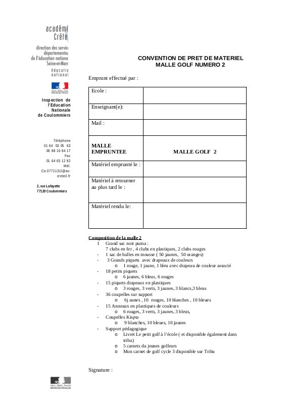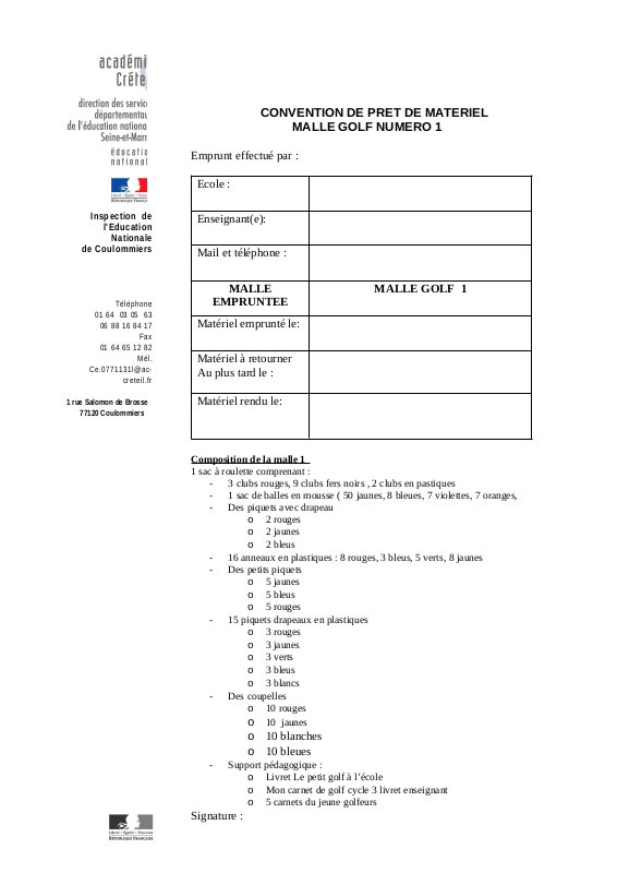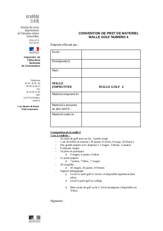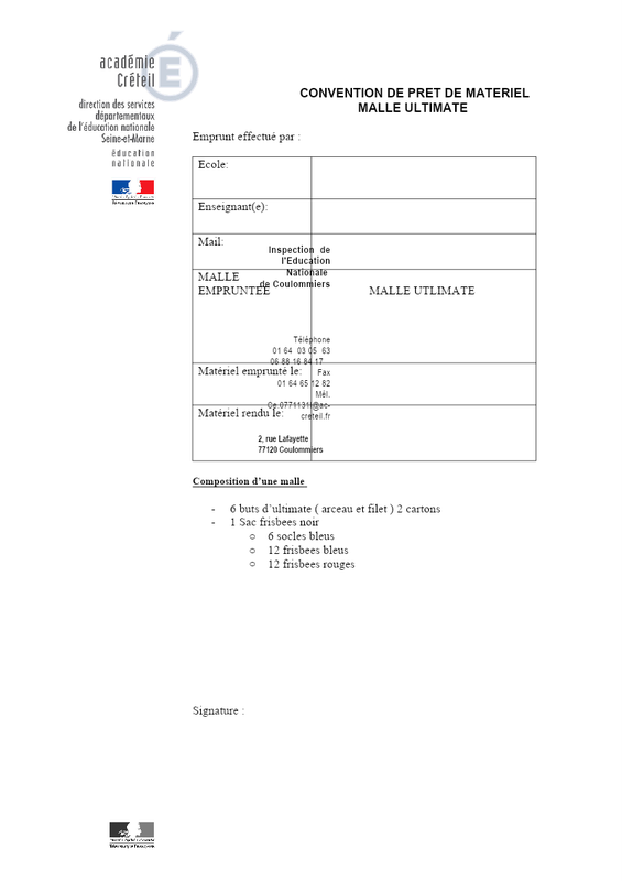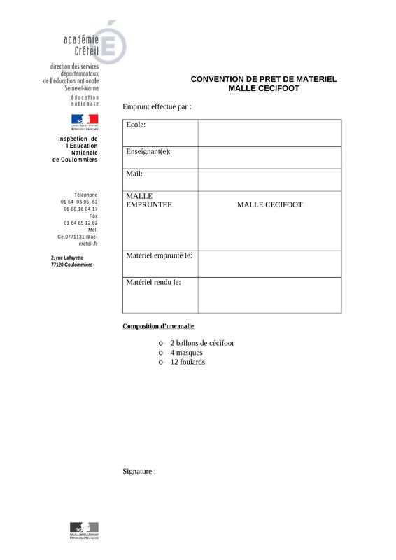 L' Éducation Physique et Sportive à l'écoleTéléchargez la convention correspondant à la malle souhaitée, complétez le document, puis envoyez-le avec les dates précises au secrétariat de l'inspection à l'adresse suivante : ce.0771131l@ac-creteil.fr, en mettant le CPC EPS en copie : sandrine.vapaille@ac-creteil.fr.